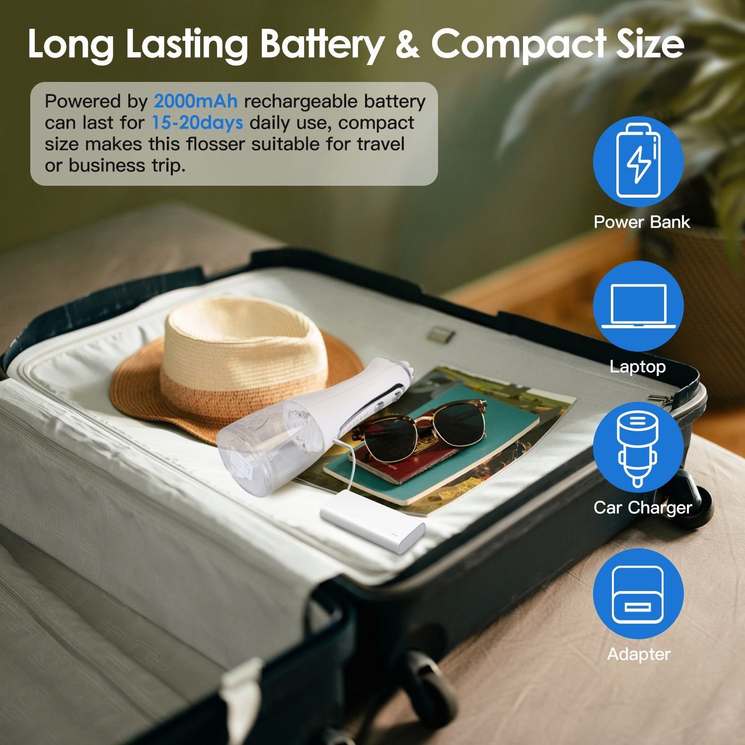 *Long-Lasting Rechargeable Battery*:Powered by 2000mAh rechargeable battery,our cordless dental flosser can last for 15-20days of normal use after about 4hours fully charged. Included USB cable(Adapter Not Included) allows it to be charged via any USB-port charging devices,such as power bank,computer,laptop,and etc..
