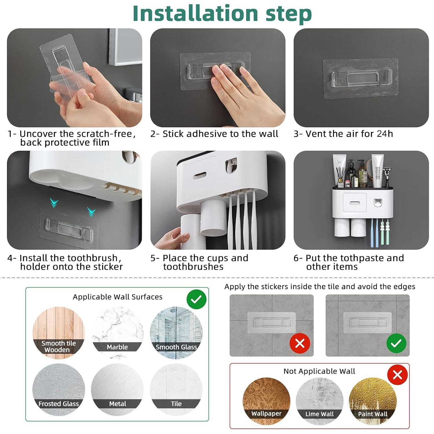 Easy to Install: The tooth brush holder is attached with strong seamless stickers. Strong adhesive, toothbrush holder wall mounted. Easy to install, no drilling and no tools, fixed well, will not fall off and break the wall.. Please note that this sticker is only applicable to surfaces such as smooth tile, wooden wall, smooth marble, smooth glass, frosted glass, smooth metal. (Product size: 10.78*3.93*5.19in)